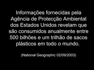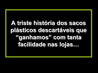 O documento descreve o impacto negativo dos sacos plásticos descartáveis no meio ambiente, especificamente nos oceanos. Centenas de bilhões de sacos são consumidos anualmente e menos de 1% é reciclado, com a maioria acabando nos oceanos. Isso causa danos à vida selvagem através da ingestão e enroscamento. Muitos países e cidades têm proibido ou limitado o uso de sacos plásticos para reduzir esse impacto.