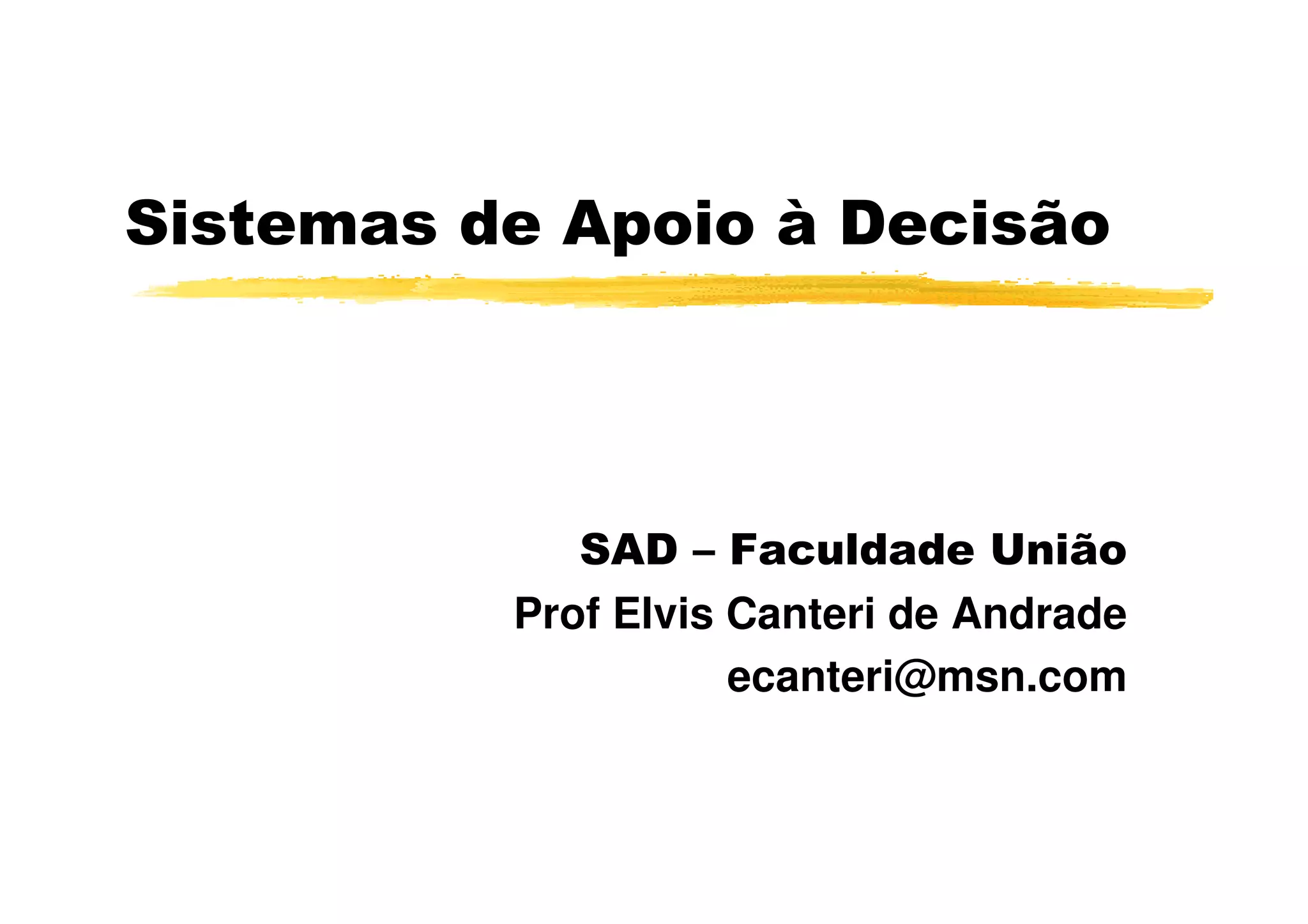 O documento discute sistemas de apoio à decisão (SAD), definindo-os como ferramentas computacionais que fornecem informações para auxiliar na tomada de decisões de acordo com as políticas da organização. Também aborda problemas na implementação de SADs devido à disponibilidade de dados, e discute a evolução da arquitetura dos SADs ao longo dos anos para superar esses problemas.