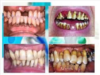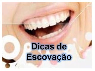 O documento discute a importância da saúde bucal e como mantê-la. Ele explica que uma boa higiene bucal envolve escovação diária dos dentes, uso de fio dental e produtos com flúor. O flúor fortalece os dentes e os protege contra cáries. O documento também discute como a cárie pode ser transmitida entre crianças pequenas através de beijos.