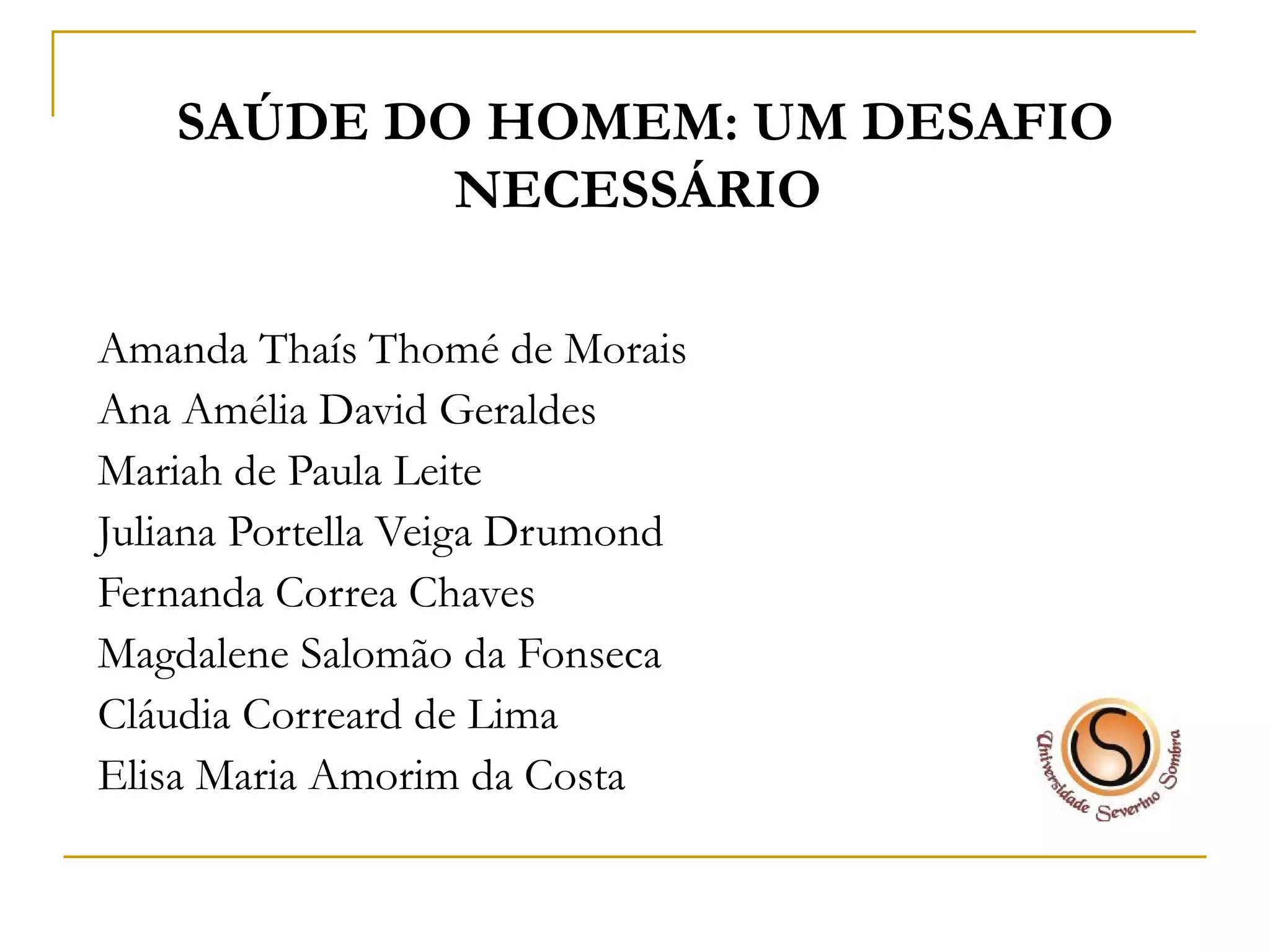 O documento discute a necessidade de incluir mais o homem nas ações de saúde pública, já que eles permanecem defasados em relação às mulheres. Alguns desafios incluem a resistência dos homens em realizar exames preventivos e em admitir problemas de saúde por questões culturais. É importante promover a discussão sobre a sexualidade masculina e adaptar as estratégias de saúde para considerar as diferenças de gênero.