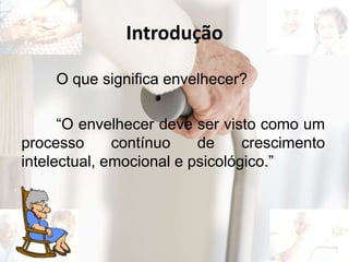 O documento discute as políticas de saúde para idosos no Brasil, incluindo a Política Nacional de Saúde do Idoso de 2006. Ele também aborda problemas de saúde comuns em idosos como doenças cardiovasculares e neurodegenerativas, além dos benefícios da atividade física regular para essa população. Por fim, enfatiza a importância dos profissionais de saúde contribuírem para a independência e envelhecimento ativo dos idosos.