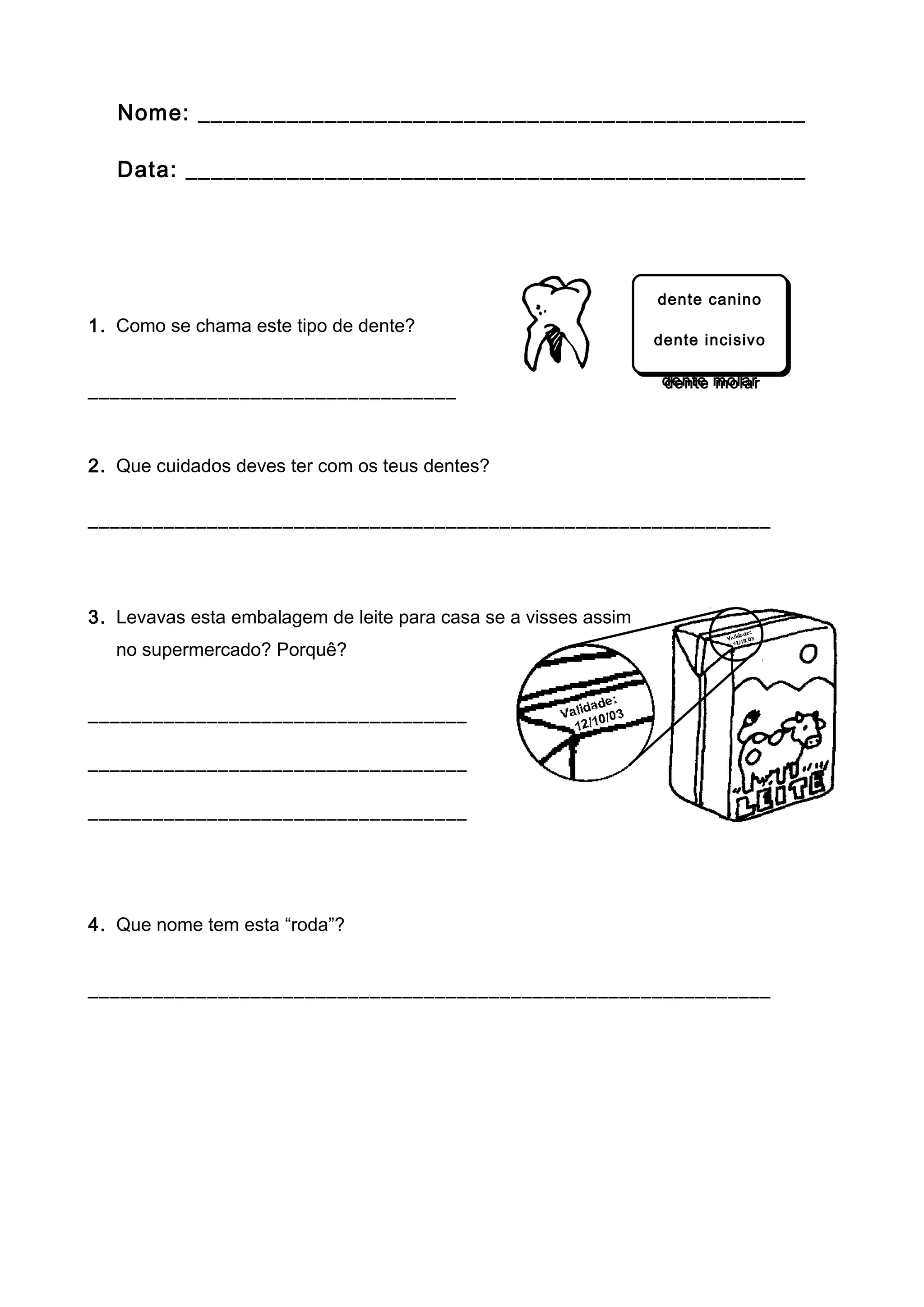 Este documento contém perguntas sobre cuidados pessoais e alimentação para crianças. As perguntas abordam identificar tipos de dentes, cuidados com os dentes, escolher leite no supermercado, nomear "rodas", origem de alimentos, cuidados com higiene pessoal e comparar espertidão em meninos.