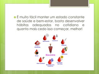 O documento discute a importância da saúde e do bem-estar, enfatizando a necessidade de se desenvolver hábitos saudáveis desde cedo, como ter uma alimentação balanceada, praticar exercícios físicos regularmente, dormir bem, manter hábitos de higiene e fazer check-ups médicos periódicos.