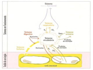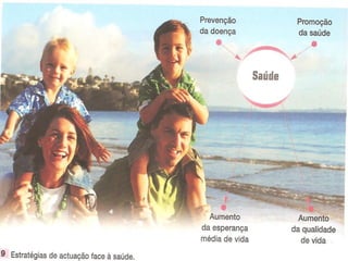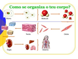 O documento discute a organização do corpo humano, desde o nível celular até os sistemas de órgãos. Explica que os tecidos são constituídos por células semelhantes com a mesma função, e os órgãos são constituídos por tecidos. Também aborda como a saúde depende de fatores físicos, psíquicos e sociais, e como a saúde pública promove a saúde através de ações como vacinação e ordenamento do território.