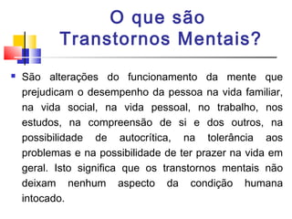A Reforma Psiquiátrica representa uma ampla mudança no atendimento de saúde mental no Brasil, garantindo o acesso da população aos serviços e respeitando seus direitos. Isso significa o fim do isolamento e tratamento nas comunidades e famílias através de centros como o CAPS. Transtornos mentais afetam cerca de 12% da população de alguma forma e 2,3% do orçamento do SUS é destinado à saúde mental.