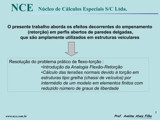 O documento discute a análise de estruturas compostas por perfis abertos de paredes delgadas utilizando a analogia flexão-retorção. A teoria de Vlasov permite equacionar o problema de flexo-torção e encontrar soluções exatas. Um modelo híbrido é desenvolvido para estimar as tensões normais de flexo-torção em estruturas como chassis de veículos utilizando elementos de viga convencionais.