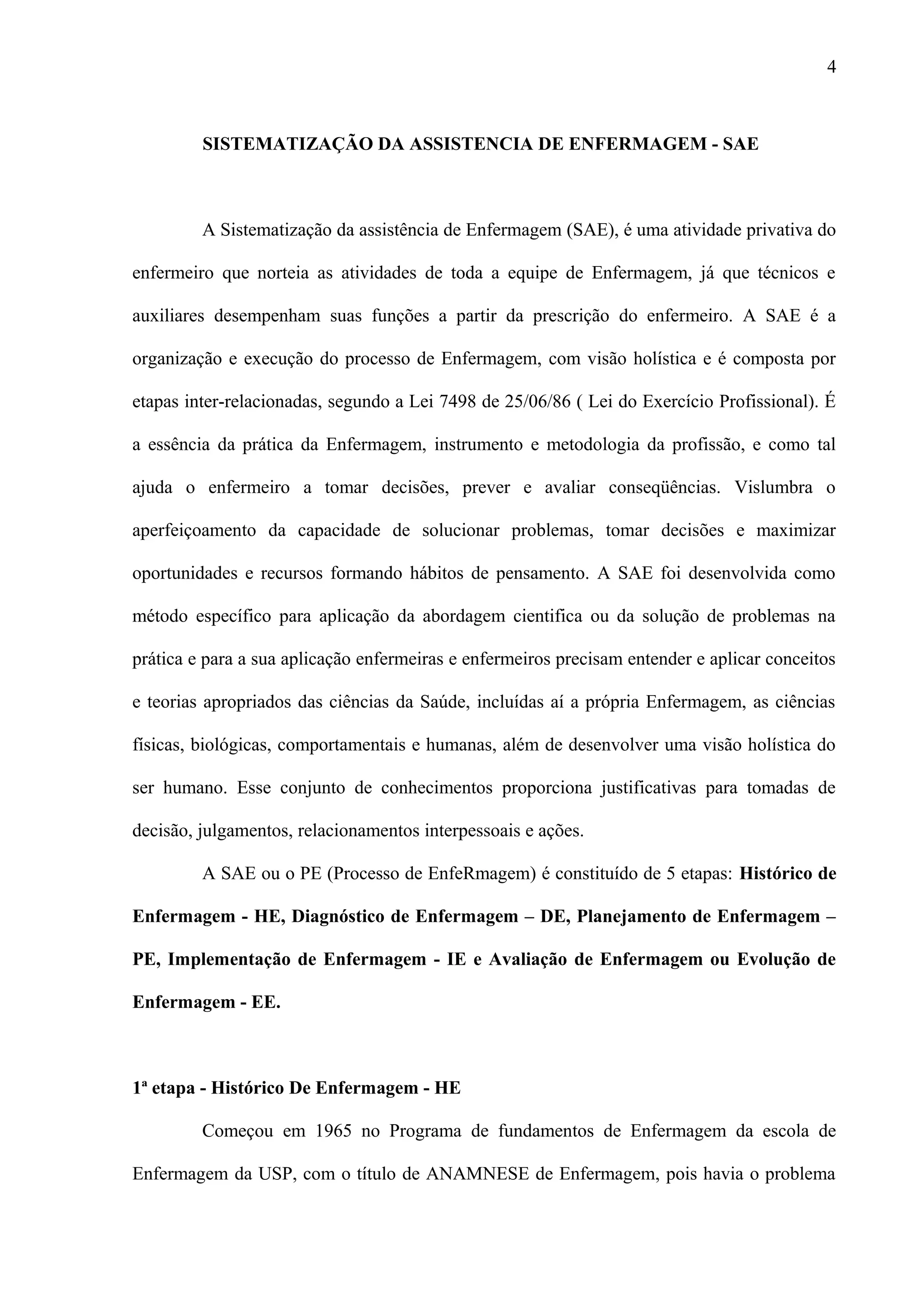 O documento descreve a Sistematização da Assistência de Enfermagem (SAE), que é composta por 5 etapas: Histórico de Enfermagem, Diagnóstico de Enfermagem, Planejamento de Enfermagem, Implementação de Enfermagem e Avaliação de Enfermagem. A SAE é responsabilidade do enfermeiro e norteia as atividades da equipe de enfermagem.