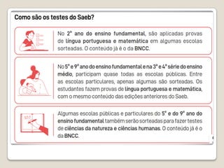O Sistema de Avaliação da Educação Básica (SAEB) avalia a qualidade da educação básica brasileira por meio de testes e questionários aplicados aos estudantes, professores e escolas. Os resultados do SAEB são usados para calcular o Índice de Desenvolvimento da Educação Básica (Ideb) e auxiliar na criação de políticas públicas para melhorar o ensino.