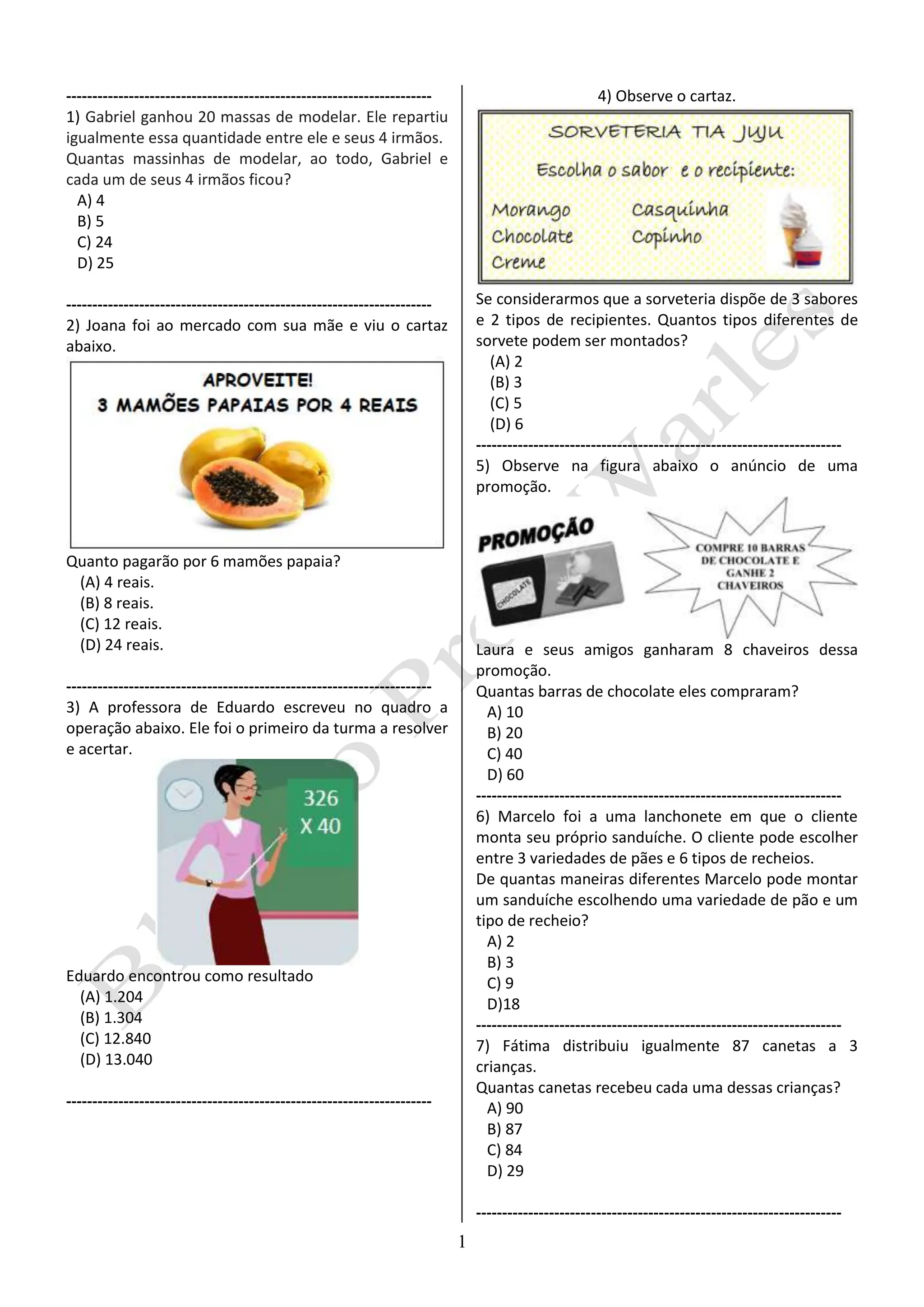 Este documento contém 25 questões de múltipla escolha sobre operações matemáticas, interpretação de gráficos e textos. As questões envolvem cálculos com números inteiros, fracionários e decimais.