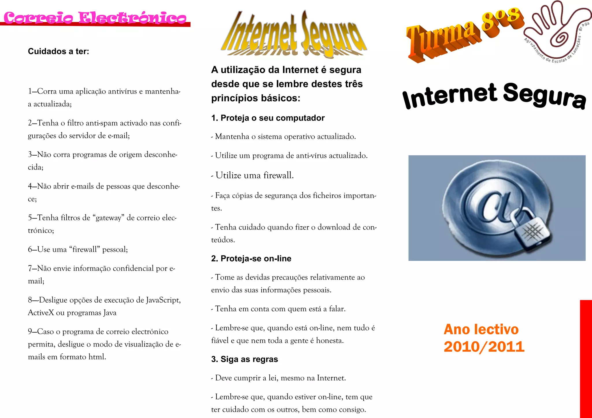 O documento fornece orientações sobre como usar o correio eletrónico de forma segura, incluindo: 1) manter software atualizado e usar antivírus e firewall; 2) tomar cuidado ao enviar informações pessoais online e interagir apenas com quem se conhece; 3) seguir as leis mesmo online.