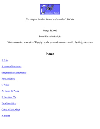 Poemas de Safo, poetisa grega do século VI a.C. O documento apresenta uma coletânea de seus poemas, abordando temas como amor, desejo, ciúme e saudade. Inclui também uma breve introdução sobre a autora e informações sobre a publicação.