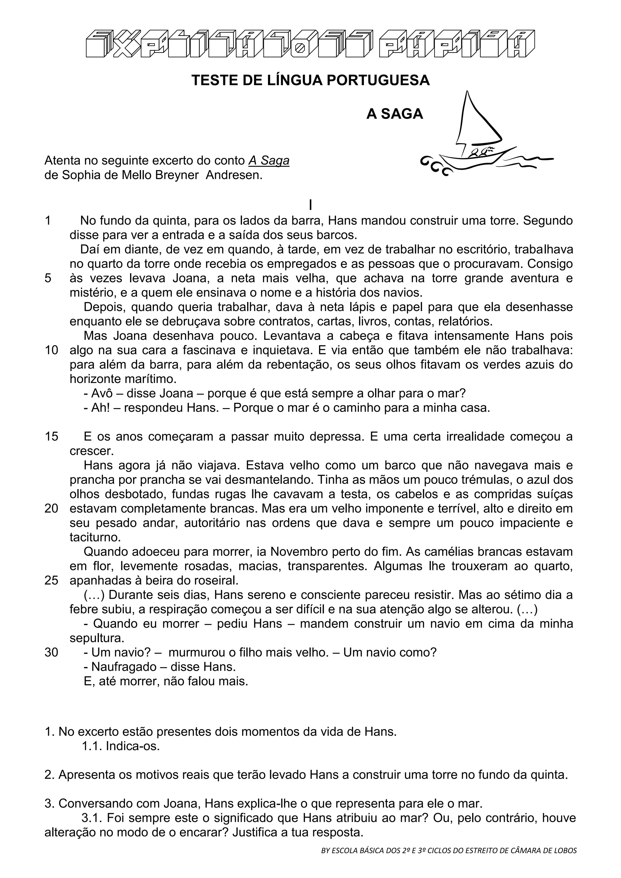 O documento apresenta dois momentos da vida de Hans: 1) quando era mais novo e mandou construir uma torre para ver os seus barcos, levando por vezes a neta Joana; 2) quando estava velho e doente, recordando o significado que o mar sempre teve para si.