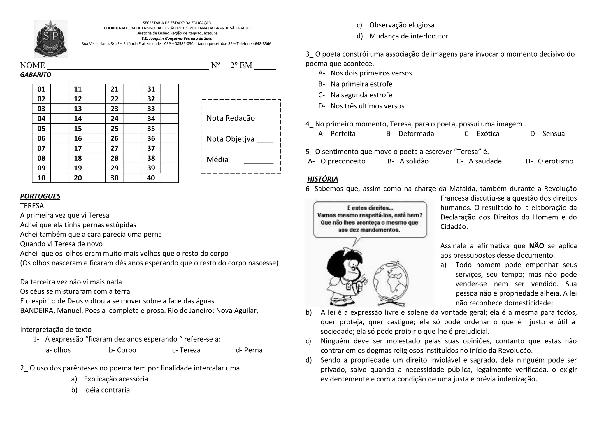 1) O documento apresenta o gabarito de uma prova de português com questões sobre o poema "Teresa" de Manuel Bandeira e sobre interpretação de texto.