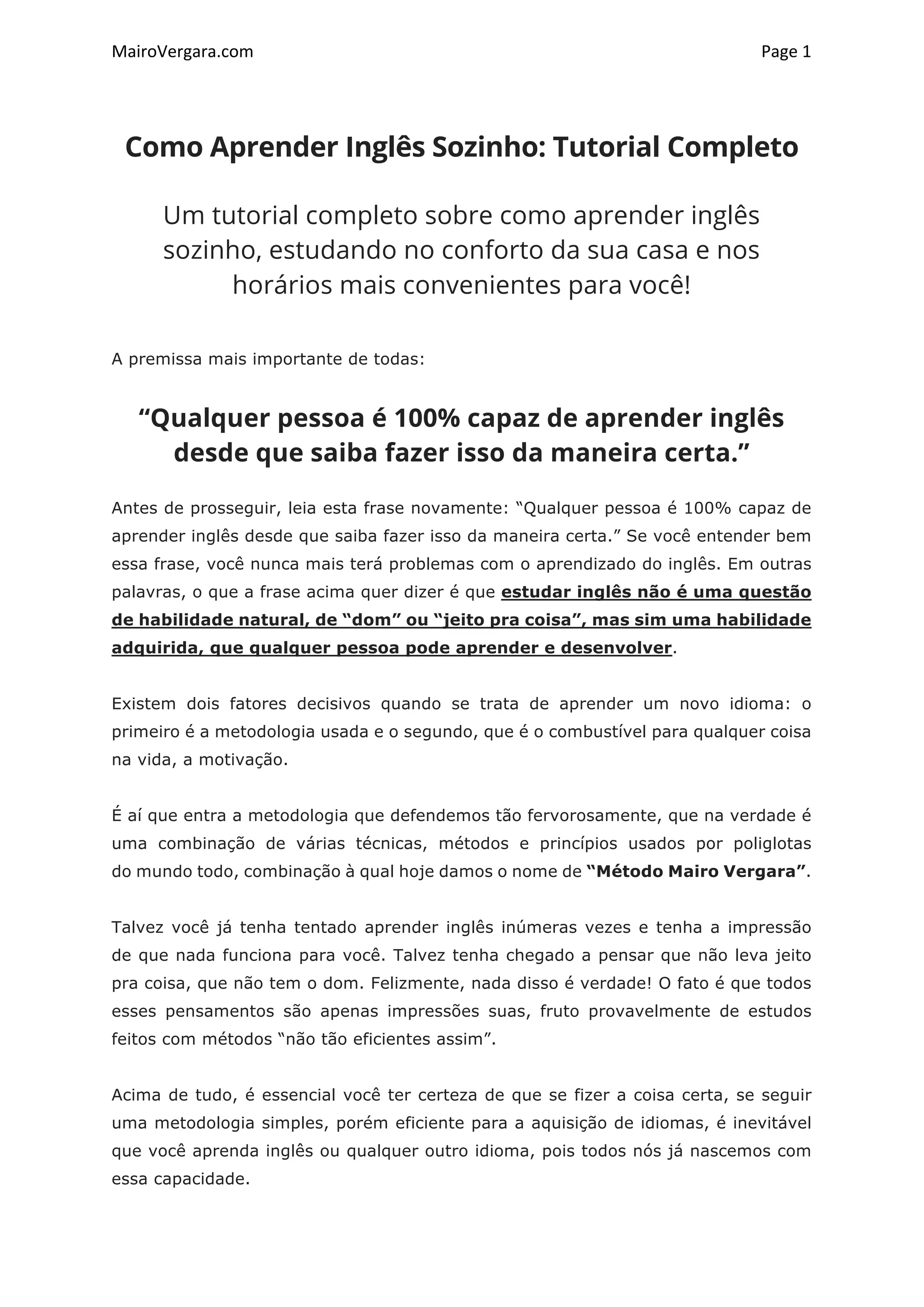 O documento fornece um tutorial sobre como aprender inglês sozinho de forma eficiente estudando em casa. Ele explica que qualquer pessoa pode aprender inglês seguindo a metodologia correta, que envolve fazer muito "input" (ouvir e ler) no idioma para adquirir vocabulário e padrões linguísticos de forma natural, em vez de focar inicialmente no estudo das regras gramaticais. A técnica principal recomendada é o estudo de textos com áudio, lendo e ouvindo repetidamente para aumentar a compreensão.