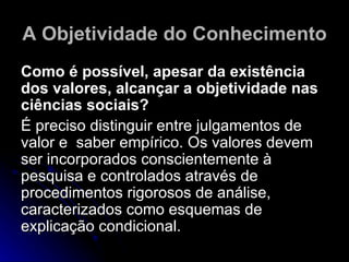 I. A objetividade no conhecimento social é possível distinguindo julgamentos de valor e saber empírico, incorporando valores de forma consciente e controlada através de análises rigorosas.