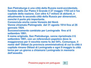 San Pietroburgo é uma cidade fundada em 1703 na Rússia pelo Czar Pedro, o Grande e foi a antiga capital do país. Com mais de 4,7 milhões de habitantes, é atualmente a segunda maior cidade da Rússia e seu principal porto. Também conhecida como Veneza do Norte, a cidade teve seus nomes alterados para Petrogrado e Leningrado antes de retornar ao nome original de São Petersburgo em 1991.