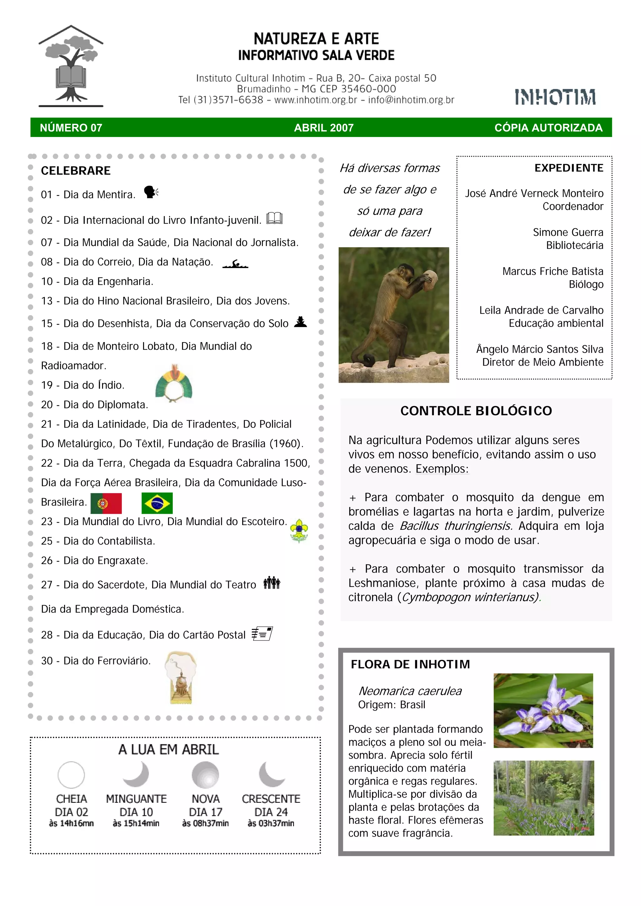 Este documento lista datas comemorativas do mês de abril, incluindo o Dia Mundial da Saúde e do Jornalista, e fornece informações sobre controle biológico na agricultura e sobre a flora e fauna encontradas no Instituto Inhotim.
