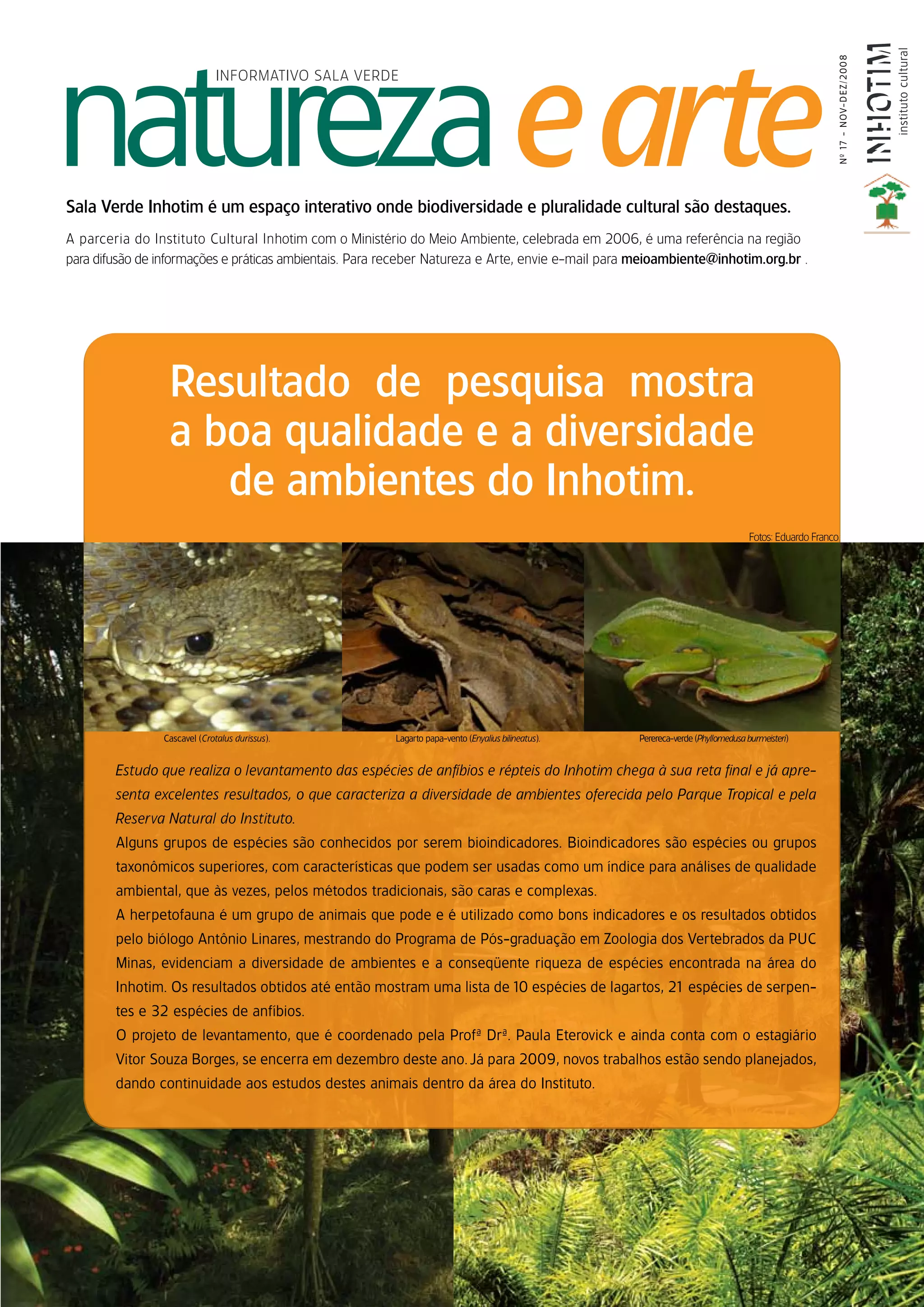 O documento resume um estudo sobre espécies de anfíbios e répteis no Instituto Inhotim. O estudo identificou 10 espécies de lagartos, 21 espécies de cobras e 32 espécies de anfíbios, demonstrando a diversidade de ambientes no Inhotim. O projeto de levantamento será concluído em dezembro.