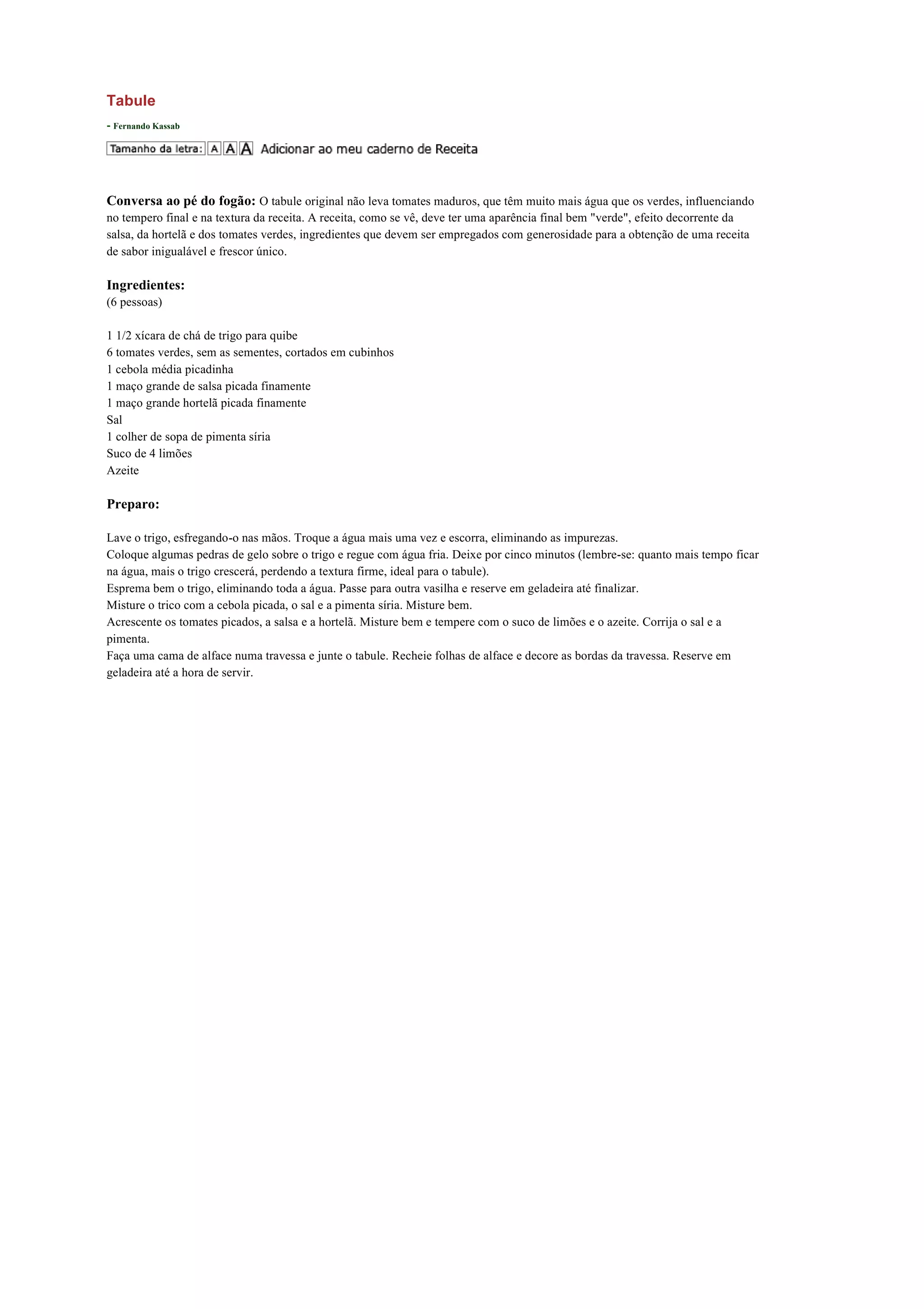 O documento fornece a receita tradicional do tabule, um prato libanês à base de trigo. A receita enfatiza que os tomates verdes devem ser usados em vez de maduros para manter a aparência e textura verdes características do prato. Além disso, instrui sobre o preparo do trigo e a mistura dos ingredientes, que incluem trigo, tomate, cebola, salsa, hortelã, suco de limão e azeite.