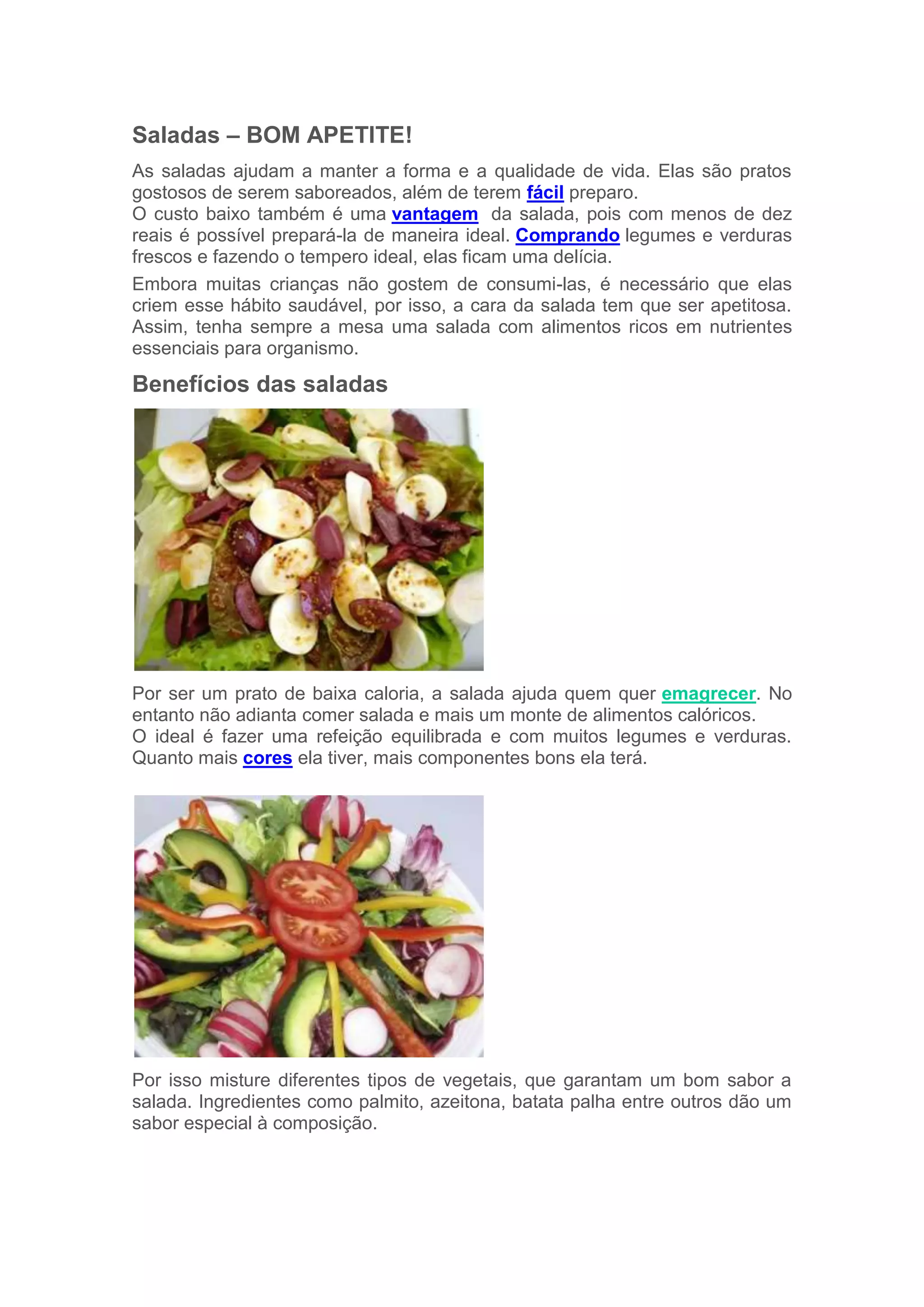 O documento discute os benefícios das saladas para a saúde e manutenção da forma física, além de fornecer duas receitas de saladas, uma com brócolos e queijo e outra crocante com macarrão parafuso.