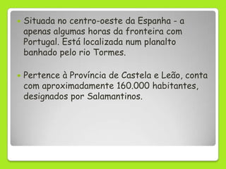 Salamanca é uma antiga cidade espanhola localizada no centro-oeste do país, conhecida por sua arquitetura histórica e por abrigar uma das universidades mais antigas do mundo. A cidade possui catedrais, edifícios da universidade e uma Plaza Mayor considerada a mais bela da Espanha. Sua rica herança histórica e monumental fez com que fosse designada Patrimônio da Humanidade pela UNESCO.