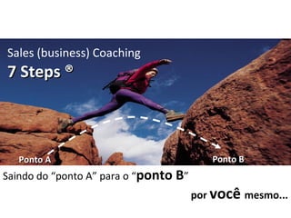 O documento descreve o método "7 Steps®" para business coaching. O método consiste em 7 etapas: 1) Alinhamento, 2) Desafios, 3) Metas, 4) Caminhos, 5) Ação, 6) Superação, 7) Follow up. Cada etapa tem objetivos específicos para ajudar o cliente (coachee) a identificar desafios, definir metas e ações para alcançá-las, e superar barreiras.