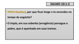 O salmo descreve a arrogância e crueldade dos ímpios que oprimem os pobres e inocentes, enquanto Deus parece distante. O salmista pede a Deus que se levante para defender os necessitados e fazer justiça, quebrando o braço dos perversos.