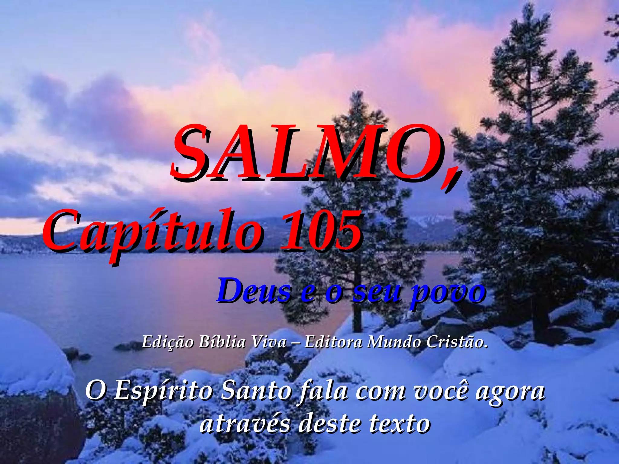 O salmo 105 resume como Deus guiou seu povo, os israelitas, através de muitas provações e milagres, desde a promessa feita a Abraão até a chegada na Terra Prometida. O salmo descreve como Deus protegeu os israelitas dos egípcios, os libertou da escravidão através de Moisés e Arão, os alimentou e guiou no deserto até chegarem em Canaã.