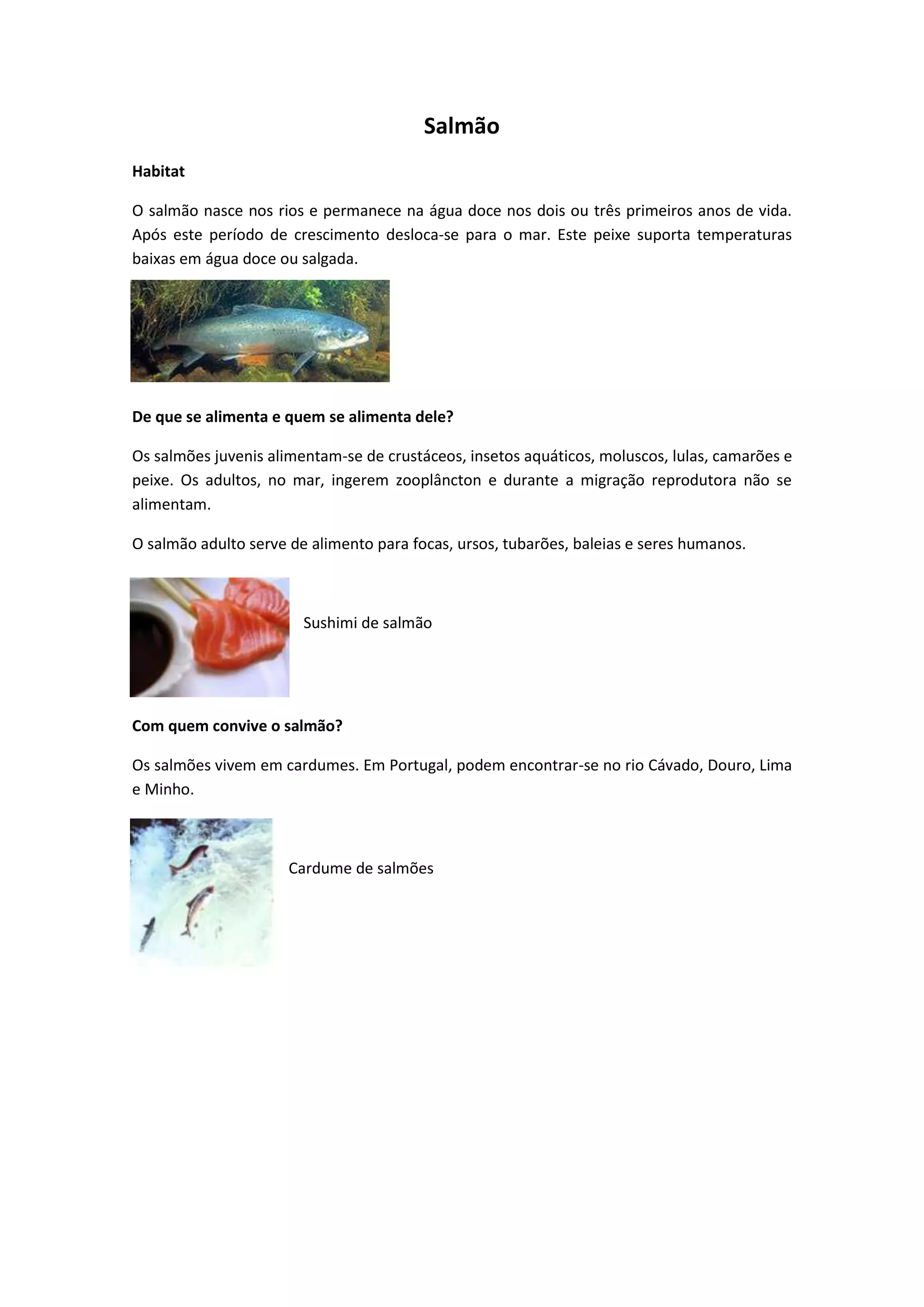 O salmão nasce em rios de água doce, vive seus primeiros anos lá se alimentando de pequenos animais, depois migra para o mar onde se alimenta de zooplâncton, e eventualmente retorna aos rios para se reproduzir, servindo de alimento a muitos predadores durante sua jornada.