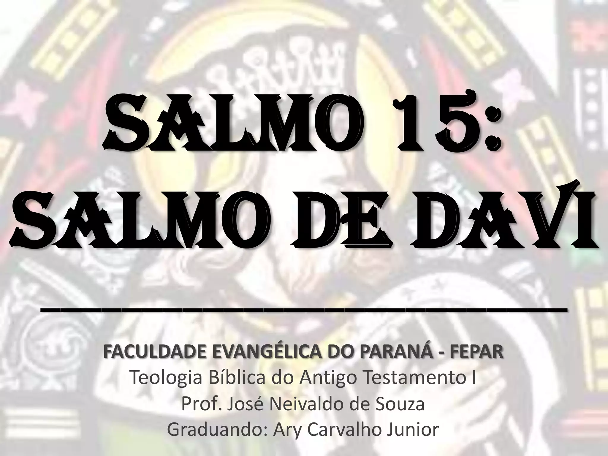 Este salmo descreve as qualidades de alguém que merece morar na tenda de Deus e no seu monte sagrado: 1) Pratica a justiça e fala a verdade com integridade, 2) Não prejudica o próximo nem espalha boatos, 3) Respeita aqueles que temem a Deus e cumpre suas promessas, mesmo com prejuízo próprio, sem aceitar suborno ou cobrar juros.