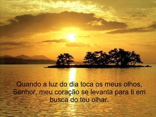 O documento é uma oração matinal dirigida a Deus onde o autor pede proteção, orientação e bênçãos para o novo dia. O autor pede a Deus que ilumine seu caminho, afaste o mal e guie seus passos na bondade, humildade e justiça. O autor também pede por um coração limpo, misericordioso e cheio da paz de Deus.