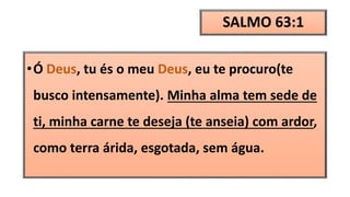 O salmo 63 descreve o desejo profundo do salmista por Deus e sua confiança nele. O salmista anseia por contemplar o poder e glória de Deus no santuário e expressa que o amor de Deus é melhor do que a vida. Ele promete louvar a Deus sempre e encontra consolo sabendo que Deus é sua ajuda.