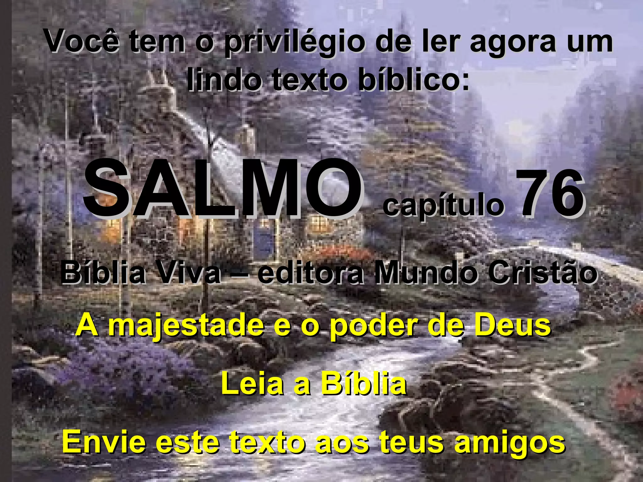 Você tem oprivilégio de ler agora um lindo texto bíblico: SALMO capítulo 76 Bíblia Viva – editora Mundo Cristão A majestade e o poder de Deus Leia a Bíblia Envie este texto aos teus amigos