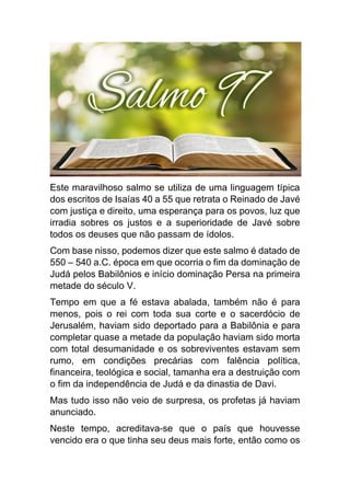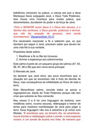 O documento descreve o contexto histórico e teológico do Salmo 47, datado do século V a.C., quando o povo de Judá estava sob domínio persa após o cativeiro na Babilônia. O salmo reafirma a fé no reinado soberano de Javé através de linguagem que descreve Sua manifestação poderosa para julgar a terra, trazendo esperança aos justos e destruição aos inimigos.