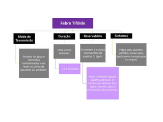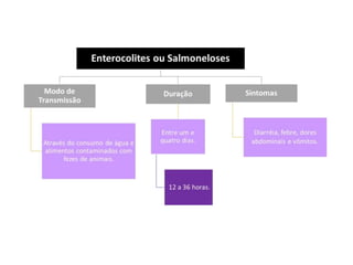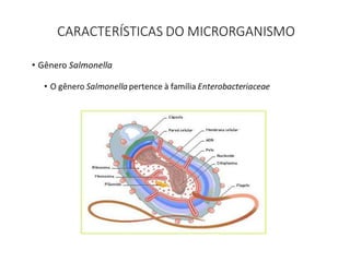 A Salmonella é uma bactéria patogênica transmitida principalmente por alimentos e água contaminados, causando doenças como febre tifóide e gastroenterite. Existem dois espécies principais de Salmonella - S. enterica e S. bongori - com mais de 2000 sorotipos que podem infectar humanos, sendo os mais comuns S. typhi e S. typhimurium.