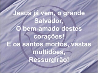 O poema celebra a segunda vinda de Jesus como o grande Salvador. Quando Ele voltar, os santos mortos ressuscitarão e os vivos serão arrebatados para sempre cantar Seu louvor. A Igreja que foi redimida na cruz de Jesus poderá andar com Ele em luz para sempre. O poema pede ao Senhor que não demore Sua vinda, para satisfazer os corações que anelam vê-Lo.