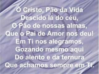 1) O documento é uma canção religiosa que se refere a Cristo como o "Pão da Vida" descendido do céu. 2) A canção expressa a alegria e consolo que os crentes encontram em Cristo, que é sua força e sustento. 3) Os crentes louvam a Cristo e ao Pai pela dádiva do "santo Pão do céu", que é penhor de graça e vida.