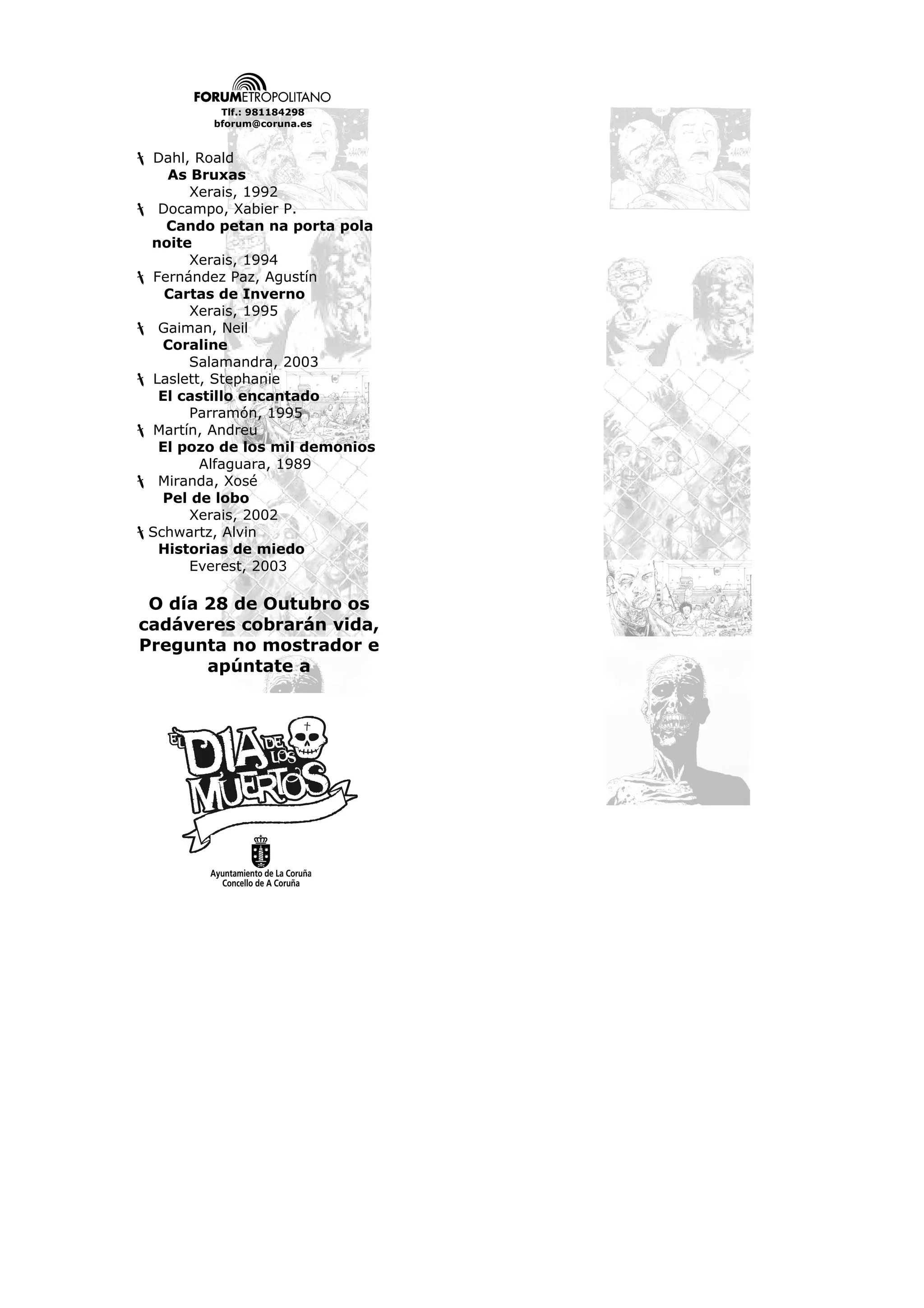O documento lista 8 livros de ficção sobre terror e mistério para crianças e adolescentes, publicados entre 1992 e 2003. Inclui obras de autores como Roald Dahl, Neil Gaiman e Xosé Miranda. O texto também anuncia um evento no dia 28 de Outubro onde os cadáveres cobrarão vida.