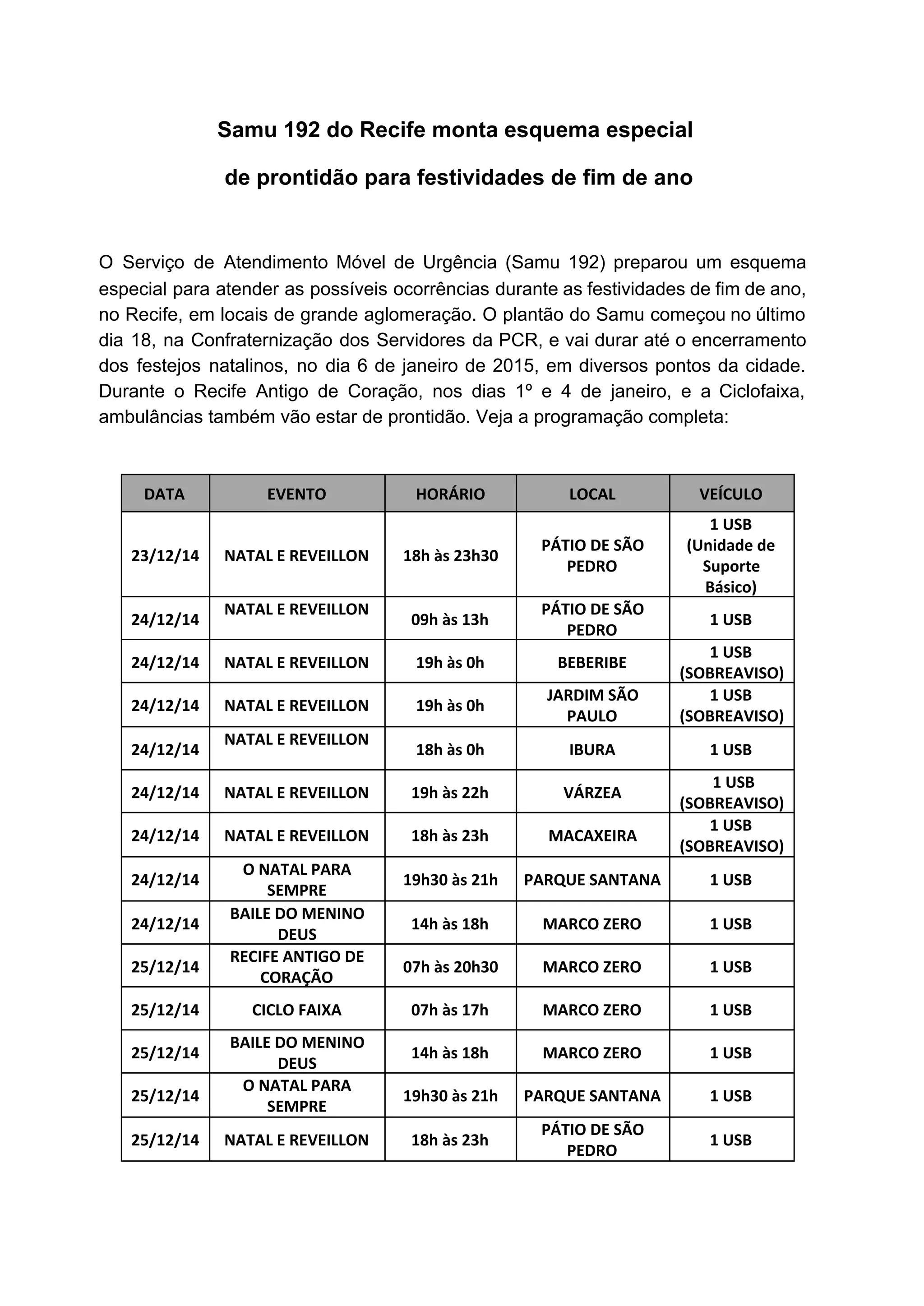 O Samu 192 do Recife preparou um esquema especial para o período de festas de fim de ano, colocando ambulâncias de prontidão em locais de eventos e comemorações entre os dias 18 de dezembro de 2014 e 6 de janeiro de 2015, para atender possíveis ocorrências.