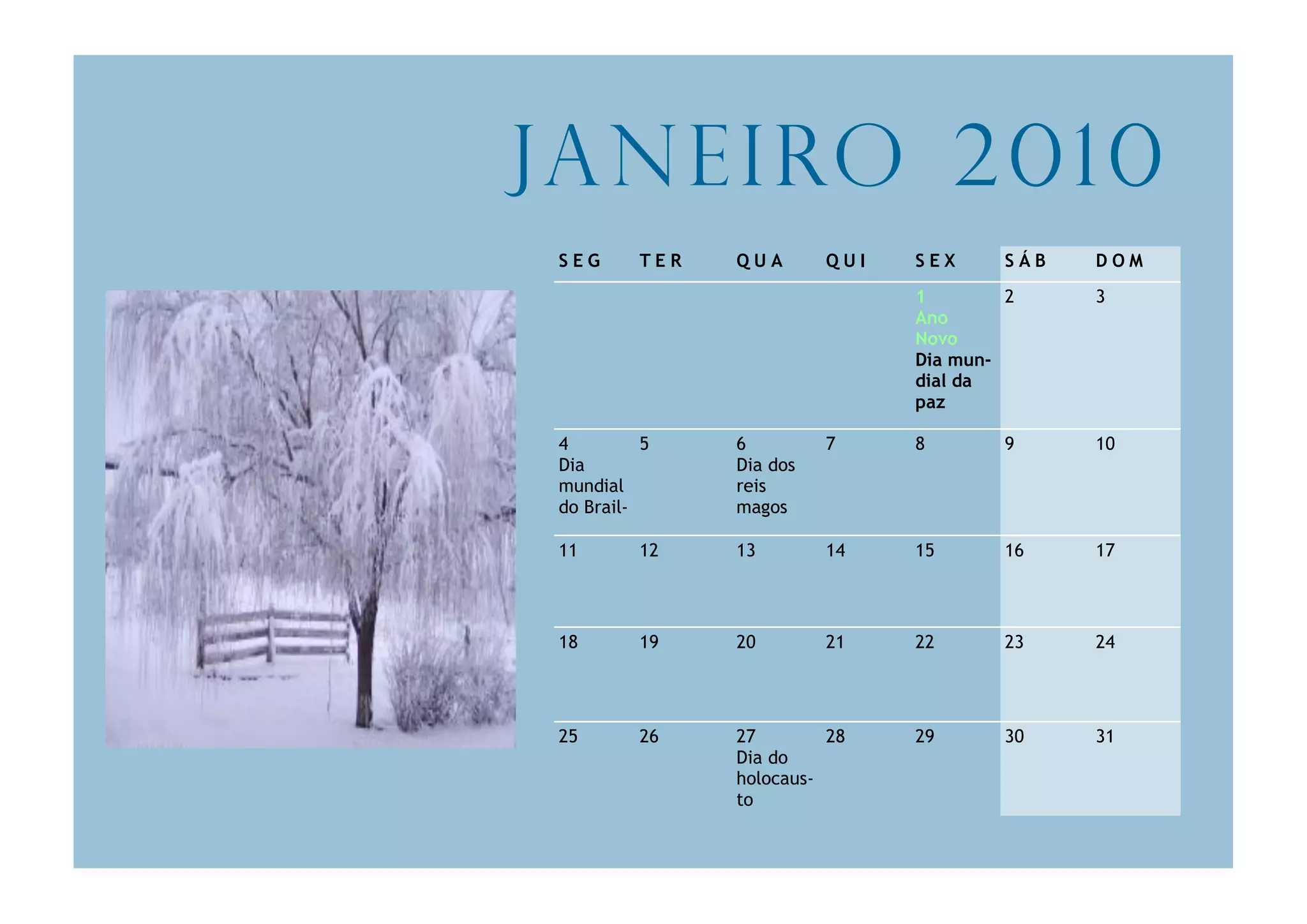 Este calendário mensal lista feriados e datas comemorativas ao longo de 2010, incluindo o Dia Mundial da Paz em janeiro, o Dia Internacional da Língua em fevereiro e o Dia Mundial da Água em março.