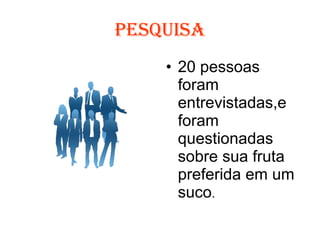 O documento resume os resultados de uma pesquisa sobre frutas preferidas para sucos, listando laranja, abacaxi, maracujá, morango e manga como as cinco primeiras. Ele também fornece detalhes nutricionais e benefícios à saúde do abacaxi, morango e laranja.