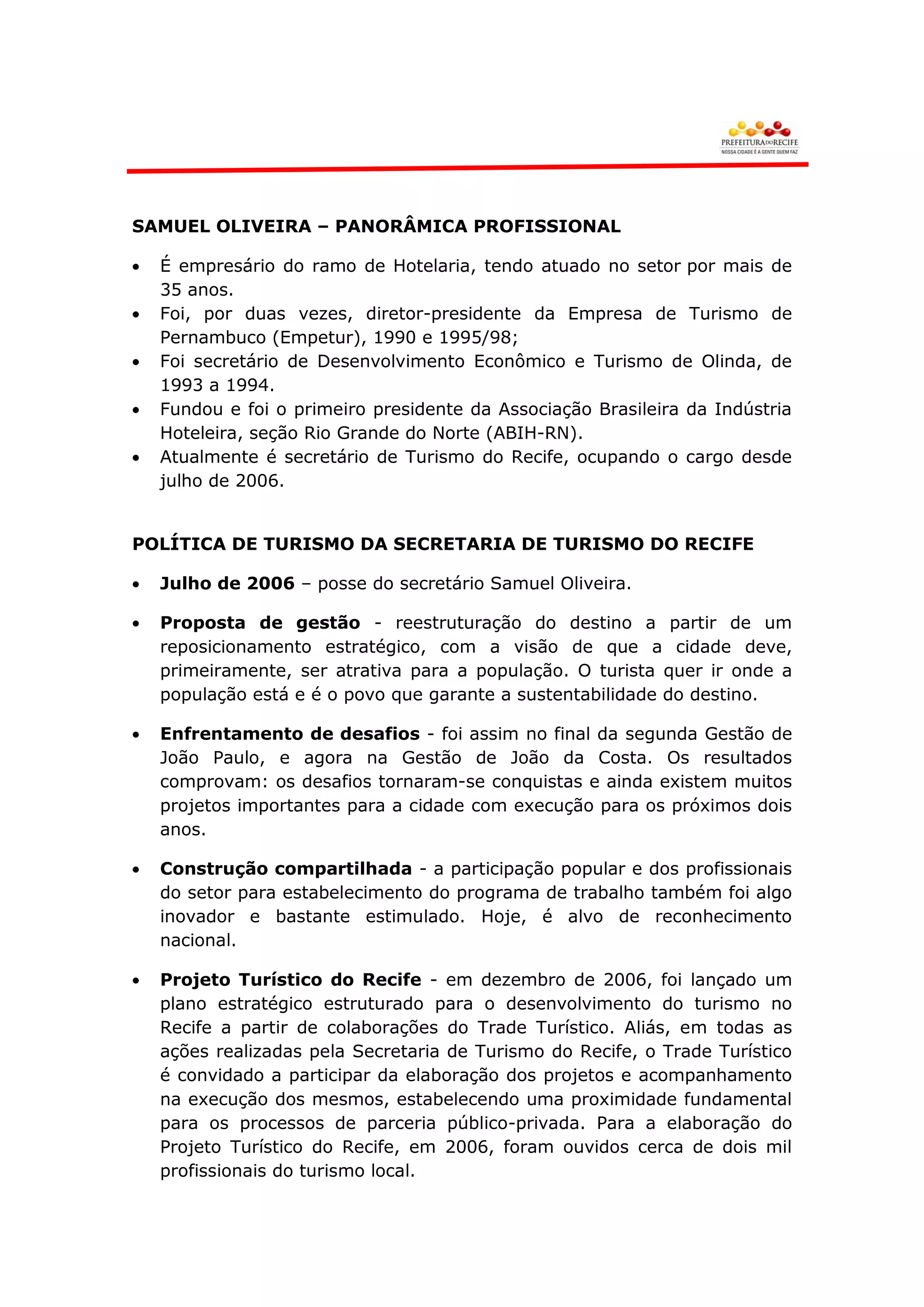 O documento descreve a carreira do secretário de Turismo do Recife, Samuel Oliveira, e a política de turismo implementada sob sua liderança desde 2006, que priorizou a participação do setor privado e resultou no crescimento sustentado do turismo na cidade.
