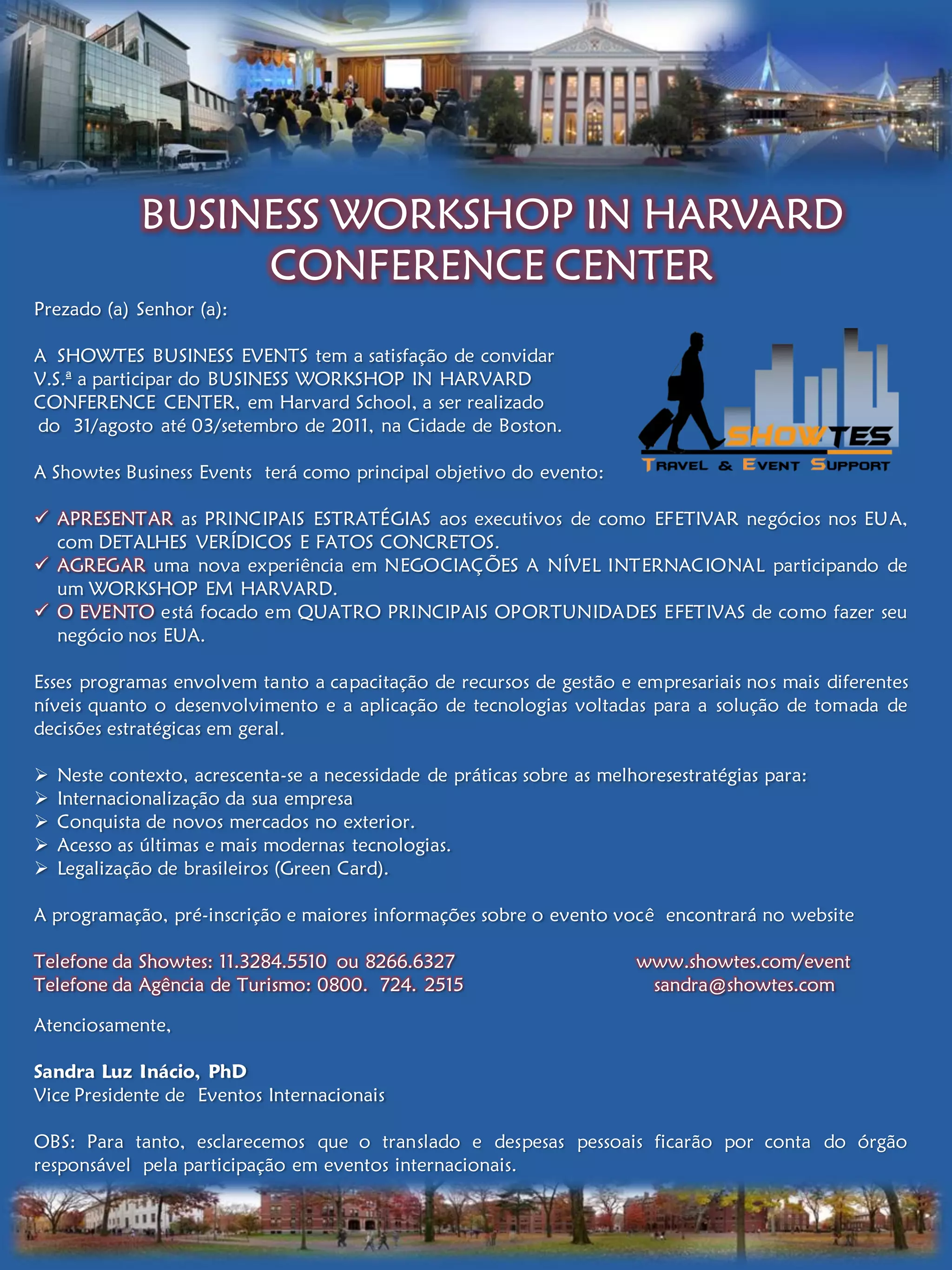 O documento convida para um workshop de negócios em Harvard sobre estratégias para efetivar negócios nos EUA, incluindo internacionalização de empresas, conquista de novos mercados, acesso a tecnologias e regularização de brasileiros. O evento ocorrerá de 31 de agosto a 3 de setembro de 2011 em Boston e fornecerá detalhes concretos sobre quatro oportunidades de negócios nos EUA.