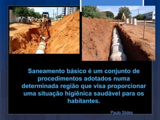 Saneamento básico envolve procedimentos como tratamento de água e esgoto, coleta de lixo, e limpeza pública para promover saúde. O esgoto sem tratamento pode poluir o meio ambiente e causar doenças. A água passa por etapas como floculação, decantação e filtragem para ser tratada e segura para consumo.