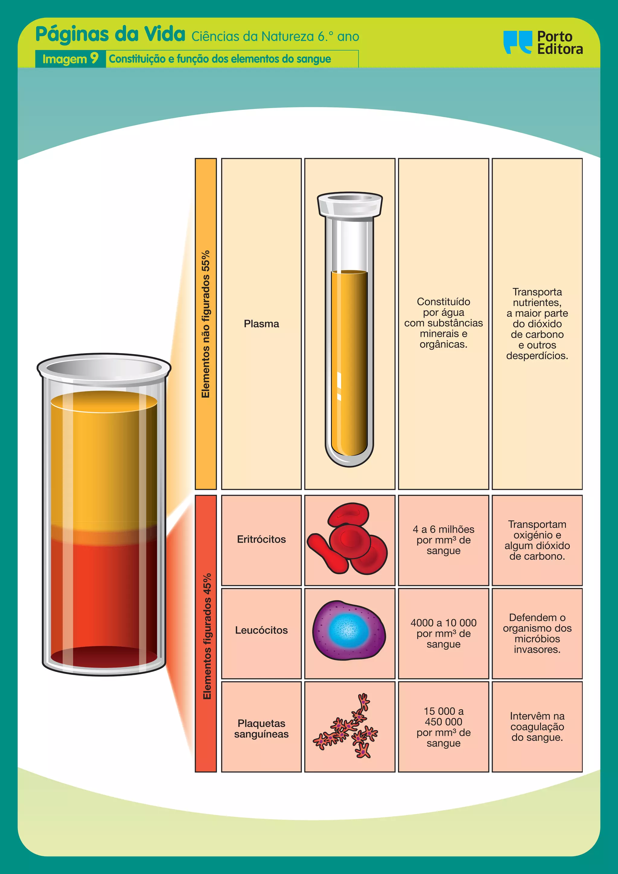 O documento descreve os elementos constituintes do sangue, incluindo o plasma, eritrócitos, leucócitos e plaquetas sanguíneas. Explica as funções de cada um destes elementos, tais como o transporte de nutrientes, oxigénio e gás carbónico pelo plasma e eritrócitos, a defesa contra micróbios pelos leucócitos, e a intervenção na coagulação do sangue pelas plaquetas sanguíneas. Fornece também a contagem normal de cada elemento por mm3 de sangue.