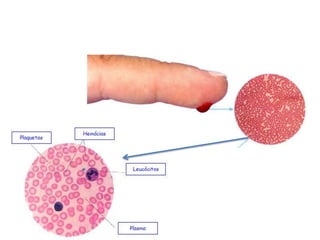 O documento descreve os principais constituintes do sangue: o plasma, as hemácias, os leucócitos e as plaquetas. Detalha as suas características, proporções no sangue e funções vitais como o transporte de oxigénio e nutrientes, defesa contra infecções e coagulação do sangue.