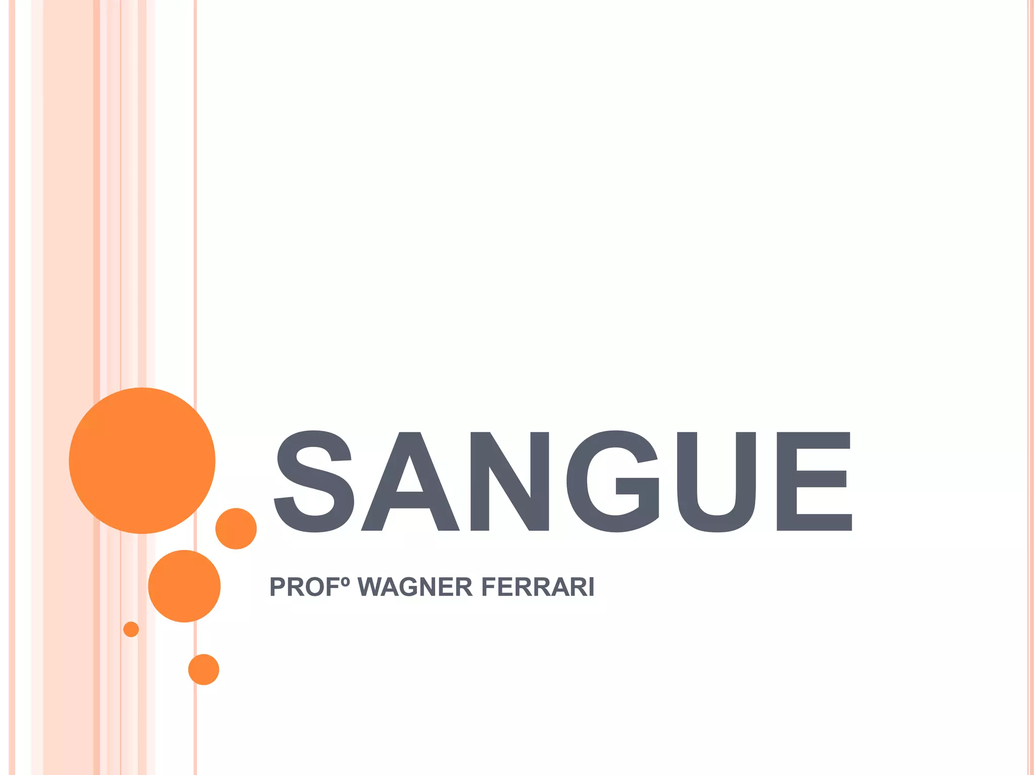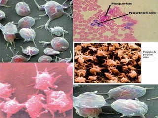 O sangue é um tecido líquido composto por plasma e elementos figurados que circula no corpo transportando oxigênio, nutrientes e removendo dióxido de carbono e resíduos. Contém hemácias responsáveis pelo transporte de oxigênio, leucócitos que defendem o corpo de patógenos, e plaquetas envolvidas na coagulação sanguínea. O plasma transporta estas células e outras substâncias pelo corpo.