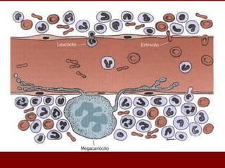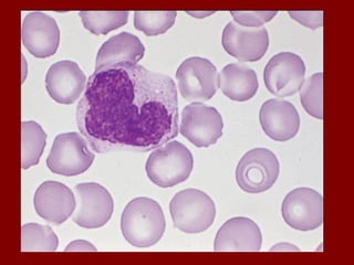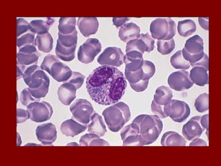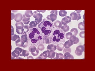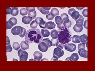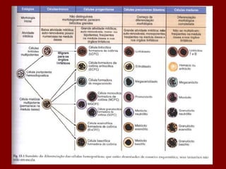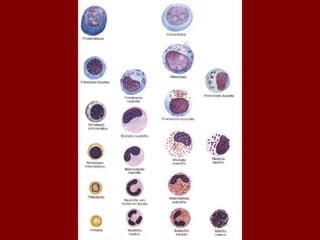 O documento descreve as principais células do sangue, incluindo eritrócitos, leucócitos, plaquetas e suas funções. Detalha os tipos de leucócitos como granulócitos e agranulócitos, e discute anemias, doenças relacionadas a cada tipo celular, e suas características morfológicas e funções no corpo.