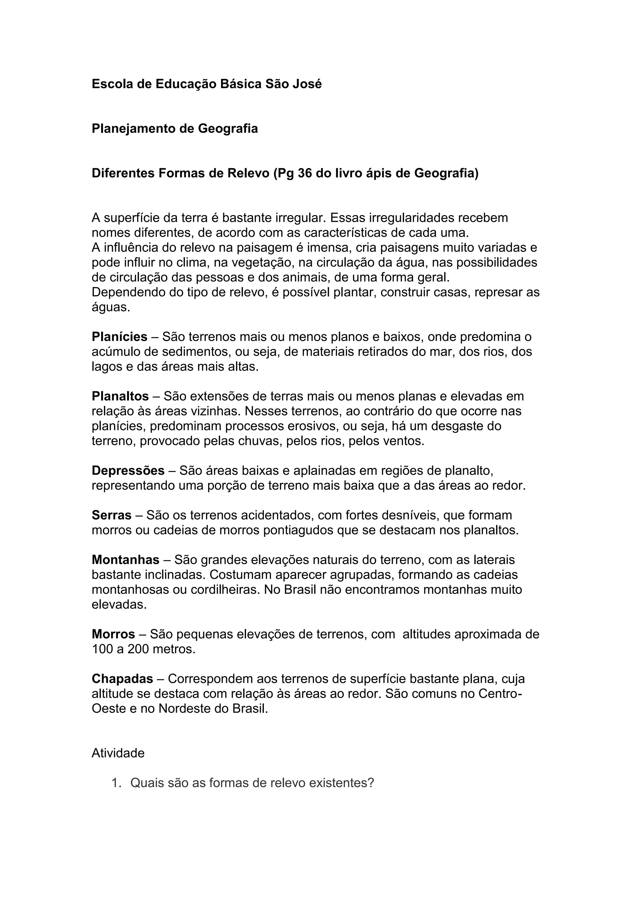 O documento descreve as diferentes formas de relevo da Terra e como elas são modificadas por fatores internos e externos. Ele também detalha os tipos de relevo encontrados em Santa Catarina, incluindo a planície costeira, serras litorâneas, e o planalto ocidental, assim como a vegetação e clima em cada região.