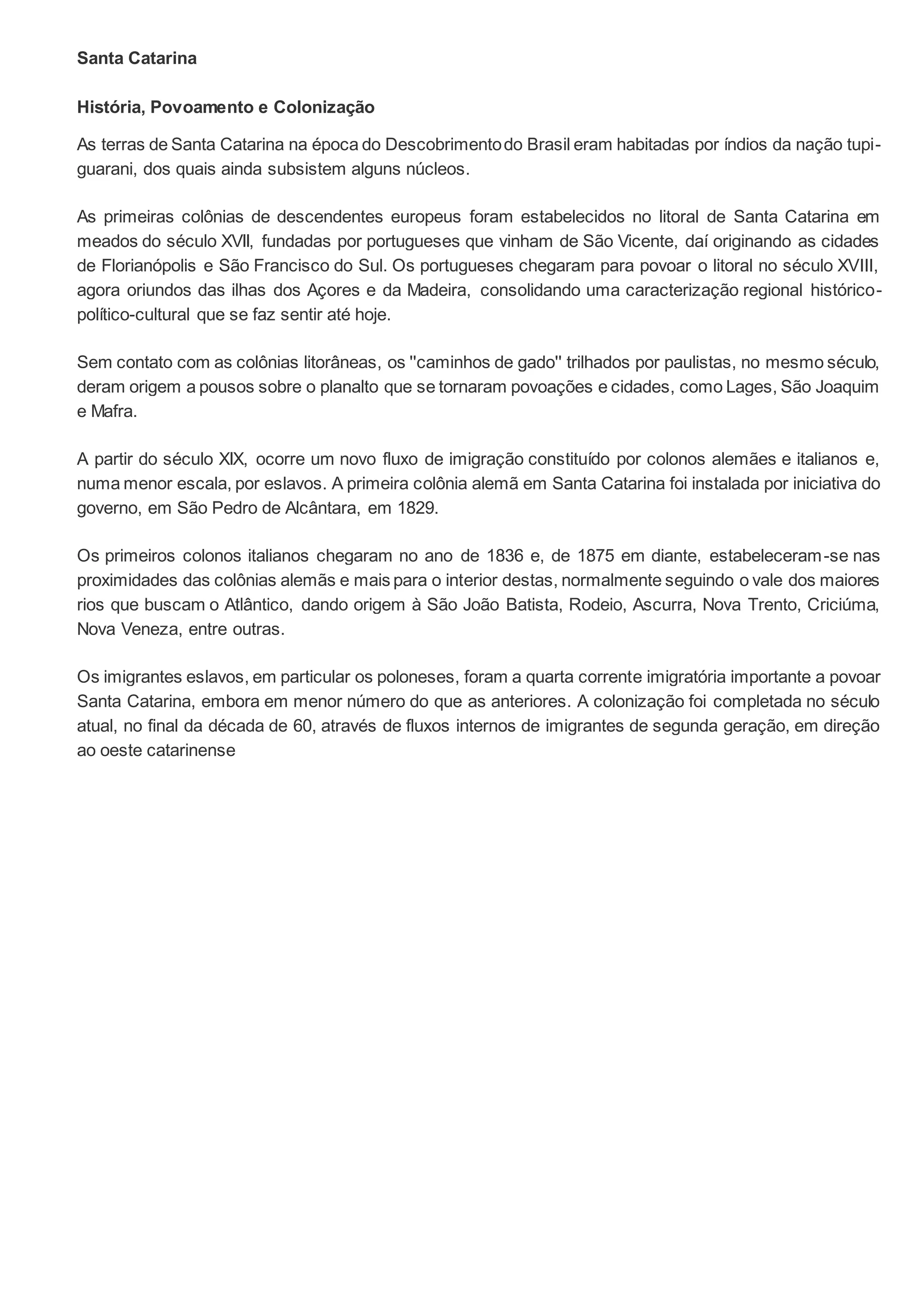 Santa Catarina foi inicialmente habitada por índios Tupi-Guarani. No século XVII, os portugueses estabeleceram as primeiras colônias litorâneas, como Florianópolis e São Francisco do Sul. No século XVIII, mais portugueses vindos de Açores e Madeira consolidaram a colonização. No século XIX, houve fluxo de imigrantes alemães, italianos e eslavos, que fundaram novas cidades e povoados no interior.